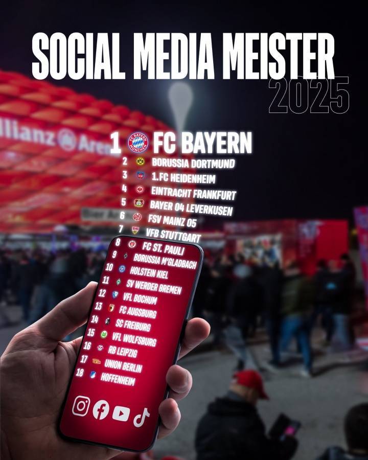 热度高!拜仁被IFI评为德甲社媒冠军,多特第二、海登海姆第三